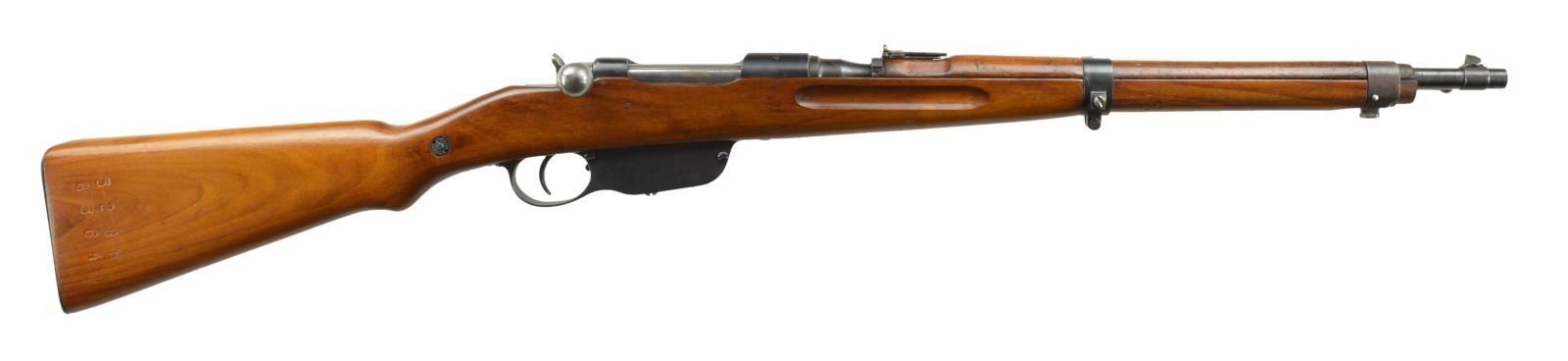 STRAIGHT PULL CARBINE. Cal. 8x50R. S# 70. Arsenal replacement 19.5" bbl. w/ crown "H" proof. Band mounted blade front sight & 2400 shritt ladder rear sight. Original S# has been grounded off & arsenal restamped S# "70". 2 Piece walnut stock w/ stacking bar, side sling bar & side sling swivel. Buttstock has various rebuild proofs along w/ S# "3286" crossed out & S# "8364". CONDITION: Good overall as arsenal refinished w/ moderate handling marks. Lightly faded blue w/ peppery oxidation. Good stock finish w/ sm. cracks. Very good bore w/ strong rifling. (22-620/MD). CURIO. $200-300.