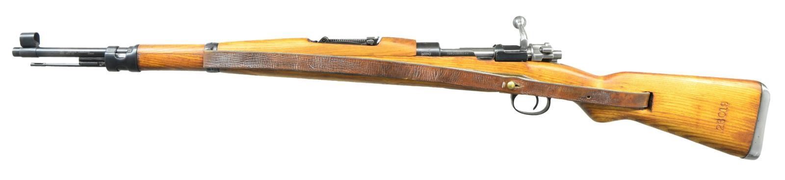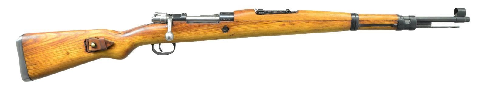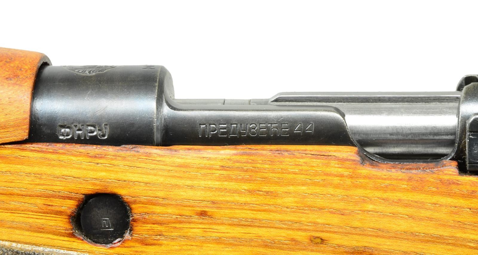 Cal. 8mm Mauser. S# T26019. All visible numbers match. Bbl. 23 1/4". Receiver is marked on top w/ Yugoslavian crest. & "M-48". Left side of receiver ring & rail has cyrillic letters & "44". Turned down bolt handle. Tangent rear sight graduated to 2,000 meters. Inverted V front sight w/ protective hood. Cleaning rod & bayonet bar are present. Milled bands & trigger guard. German style sling. Hardwood stock & hand guard w/ cup type buttplate. CONDITION: stock has very good original finish w/ sm. scattered handling marks. Metal has lg. percentage of orginal blue finish w/ light high point wear. Very good shiny bore. (22-644/RW). CURIO. $300-500.