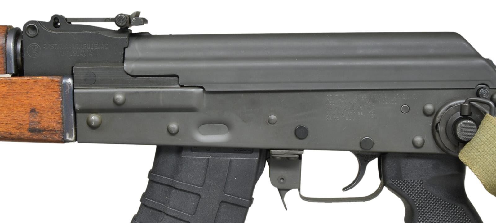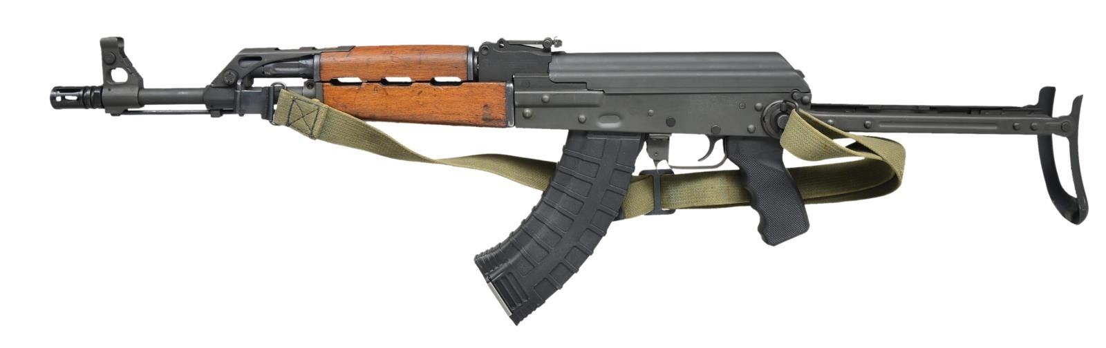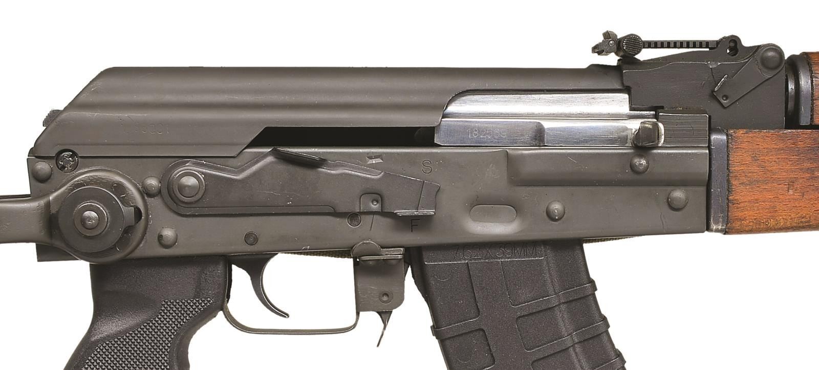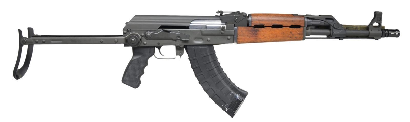 Cal. 7.62x39. S# M70AB16743. Bbl. 16". Century Arms Yugoslavian M70 under folder in the popular 7.62x39 chambering. Stamped receiver. Left hand threads on muzzle w/ an A2 style muzzle brake correctly notched for position. Protected post front sight w/ flip up night sight. Gas block incorporates a grenade launcher sight, bayonet lug & secures on board cleaning rod. Dark brown handguard & shroud. Rear tangent sight adj. from 100-1,000m. Right side controls. Tapco G2 trigger. Sling swivels at 9 o’clock position w/ green canvas sling. Matte black finish on all exposed metal surfaces. MAGS: 1-30 rd. Tapco. UNATTACHED ACCESSORIES: VISM nylon assault bag. CONDITION: finish is complete & consistent on all exposed surfaces w/ minimal wear, even under point of mechanical intervention which are usual first to go. Night sight appears to be missing insert. Folding stock locks tightly in open & closed position w/ minimal free movement. Wood handguards are normal arsenal repurposed w/ typical impressions. Top handguard exhibits a crack at 12 o’clock measuring approx. 4 1/2". Bore is bright w/ extremely aggressive rifling. Fire control mechanism appears to function correctly when cycled by hand. (21-781/JZ). MODERN. $600-900.