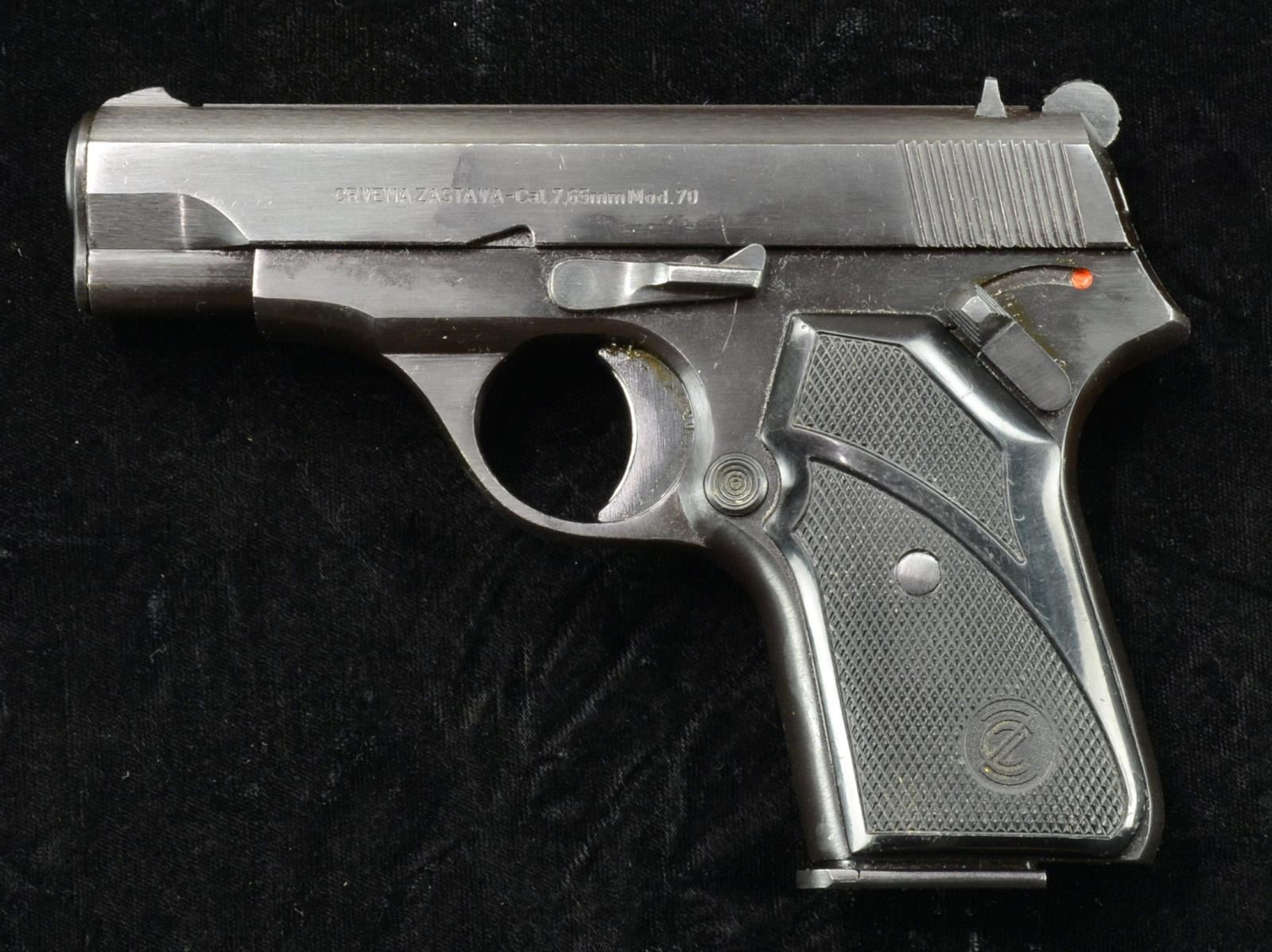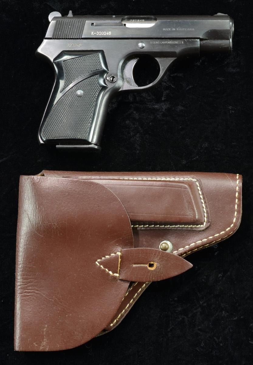 Cal. 7.65mm (32 ACP). S# 320246. Matching numbered 3 1/2" bbl. & slide. Blue finished w/ R Guns import mark on frame. 2 Piece checkered plastic grips. MAGS: 2 - 8 rd. UNATTACHED ACCESSORIES: brown flap holster w/ cleaning brush. CONDITION: very good to near excellent overall w/ light marks. Near excellent bore. (22-771/MD). MODERN. $250-400.