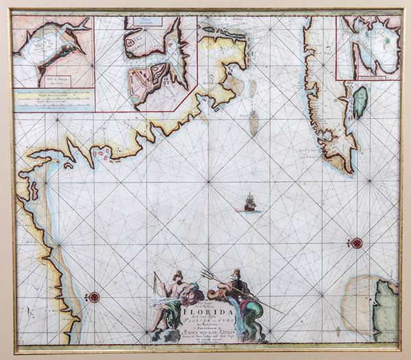 Van Keulen, Johannes. Pas Kaart Van De Boght Van Florida Met De Canaal Tusschen Florida En Cuba . Amsterdam, c. 1684-86, 20 x 23", hand colored. Matted and framed to an overall size of 31� x 34�". A sea chart of Florida and the Gulf Coast, extending from the Fort Lauderdale area to the area around Appalachiola Bay and including most of Cuba and the tip of the Yucatan. Insets of three Cuban harbors: Havana, Mantanzas and Baja Hondo (possibly Golfo de Guanahacabibes).